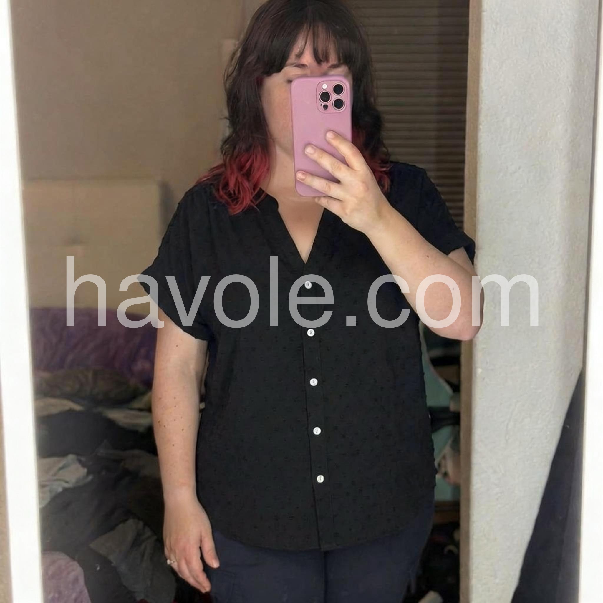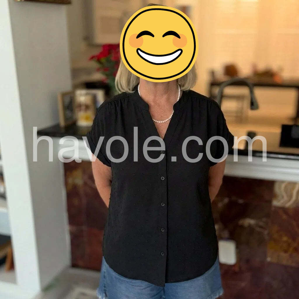 Get back to basics with this simple black top. Buttons down the front with a fold-over collar lend a classic vibe, upgraded with modern short sleeves rolled up for a casual look. Tuck this black blouse in with jeans or a skirt, or leave it out for a flowy style.