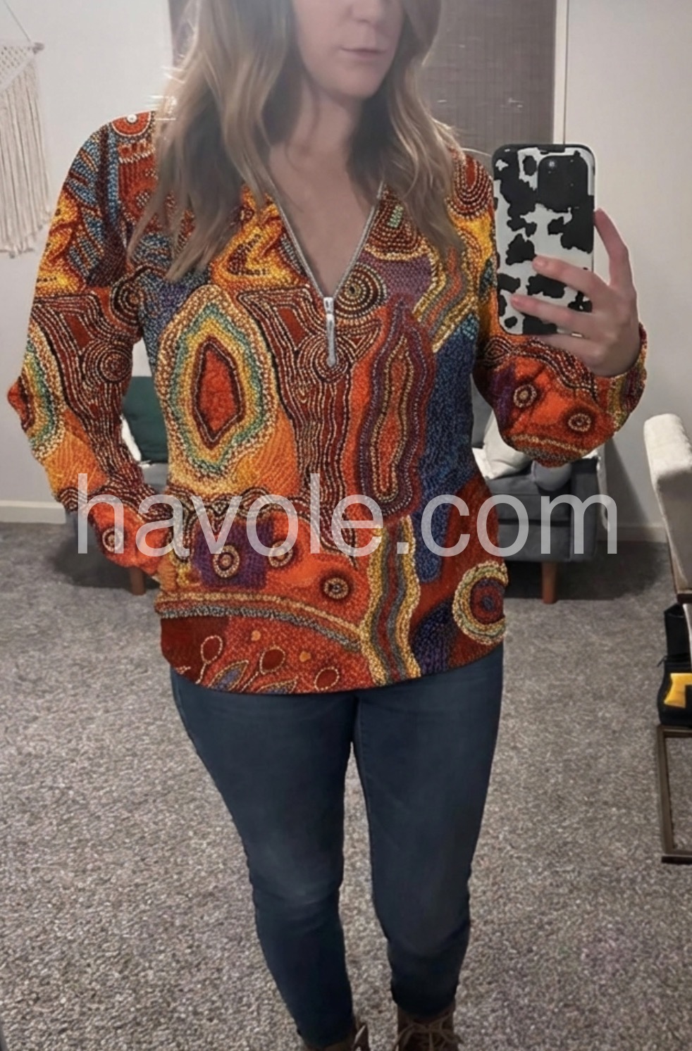 Autumn Aztec Geometric Zippered Long Sleeve Top